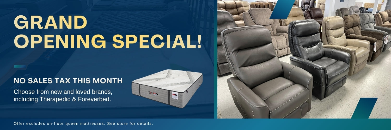 Don’t miss our grand opening event! For a limited time, enjoy no sales tax on all mattresses and recliners—huge savings on the comfort you deserve.